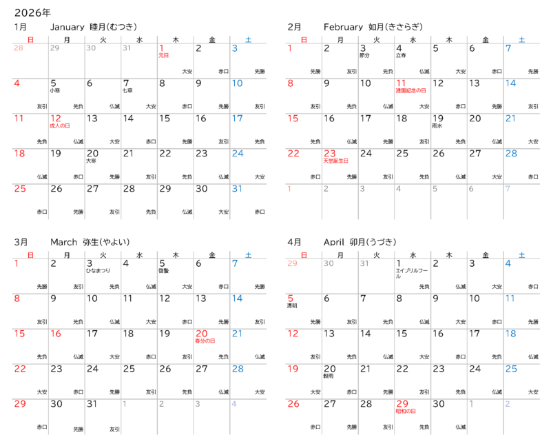 また、祝日や六曜、二十四節気などカレンダーに載せる日玉以外の情報が載っていることも多いです。