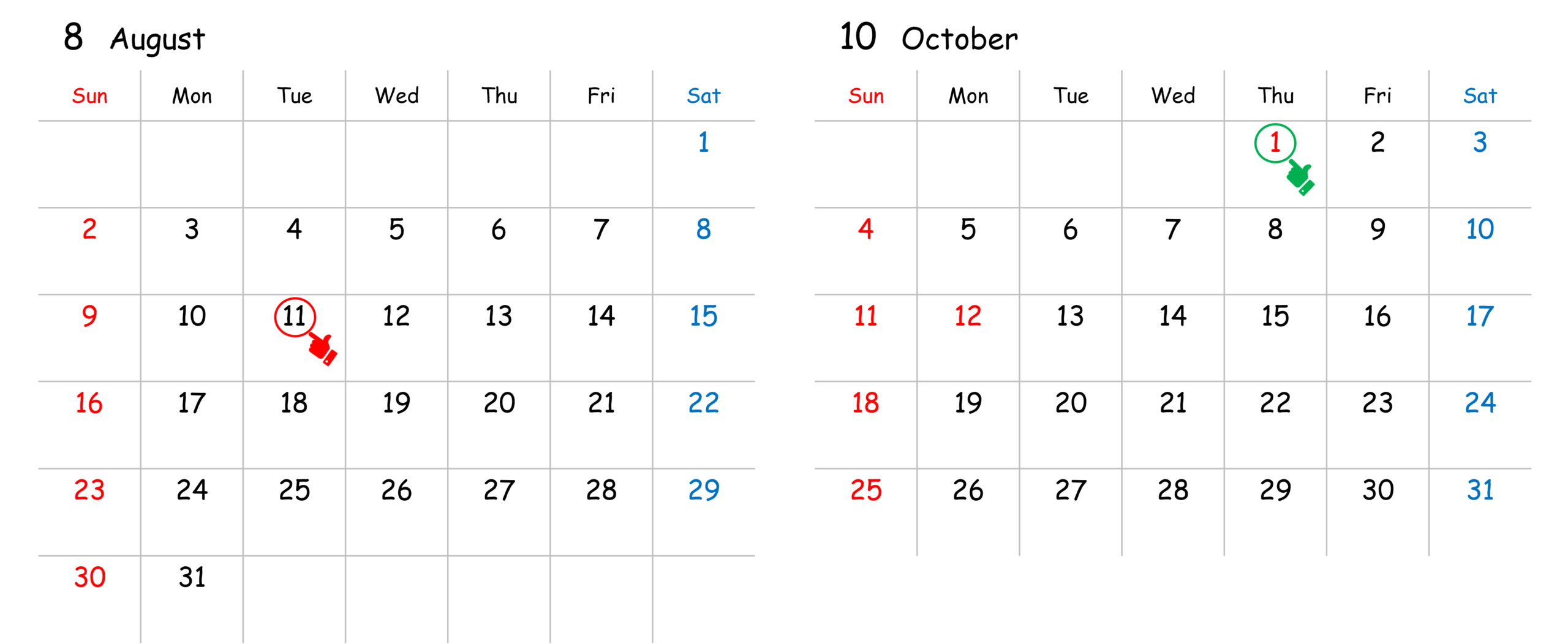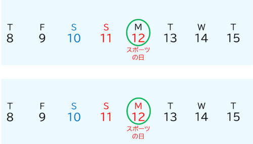 8月は11日が「山の日」だが、平日の色のままになっている。10月の祝日は第2月曜日のみだが、1日も赤文字になっている