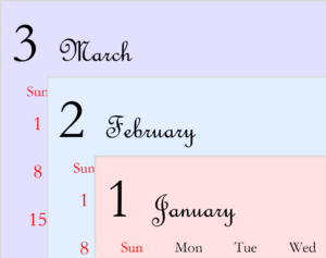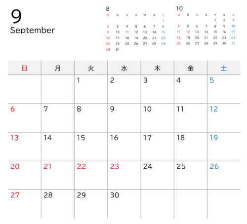 一般的なカレンダーは、土曜日が青系、日曜日・祝日が赤系の色でデザインされています。