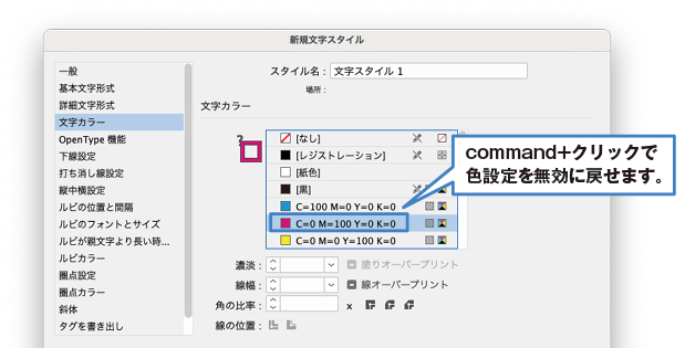 ちなみに文字スタイルのパネルなんかで色を無効としたい時はcommand+クリックです。