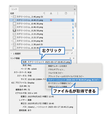 そんな時は、リンクパネルの以下の位置から右クリックでファイル名を取得できます。