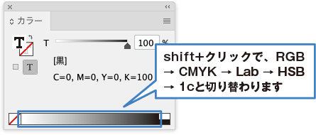 ・カラーパネルのカラーモード切り替え カラーバーをshift+クリック