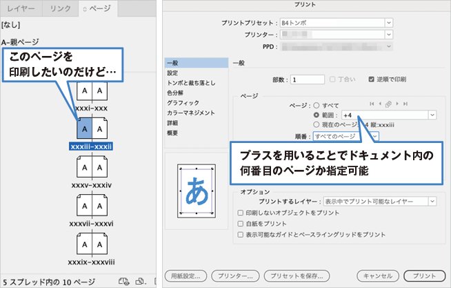 プリント、移動で目的のページを指定する時、そのドキュメントの何番目のページであるかという数値に「+」を付け足して指定できます。